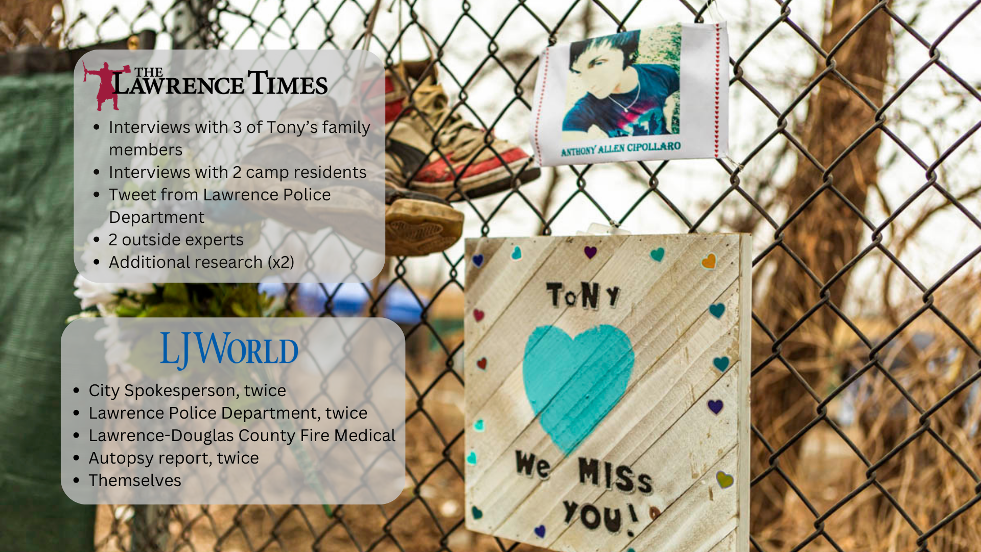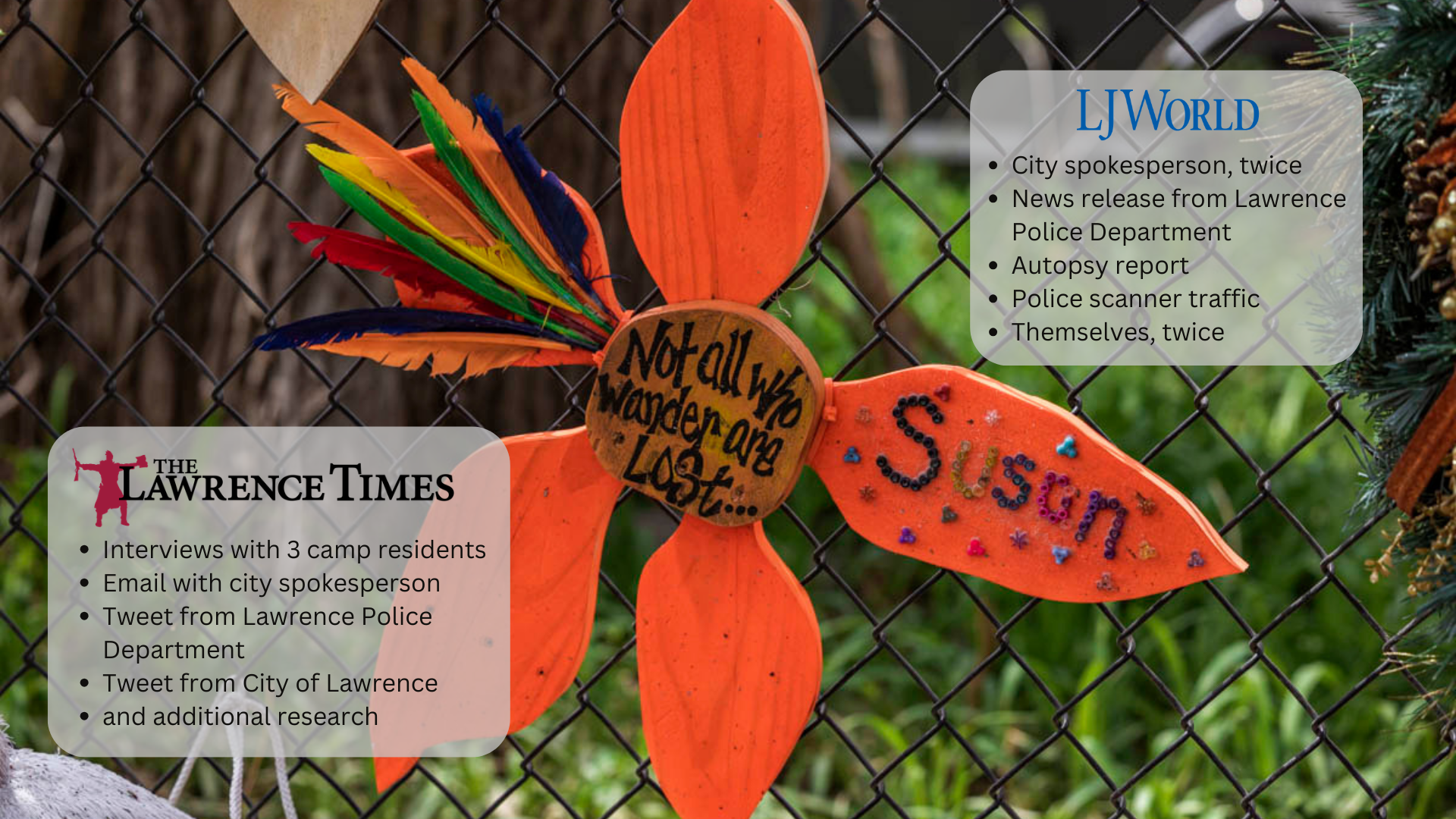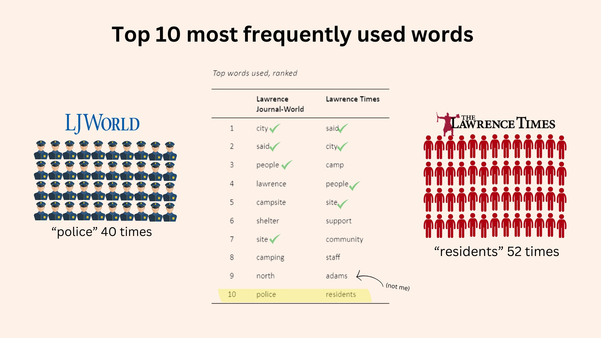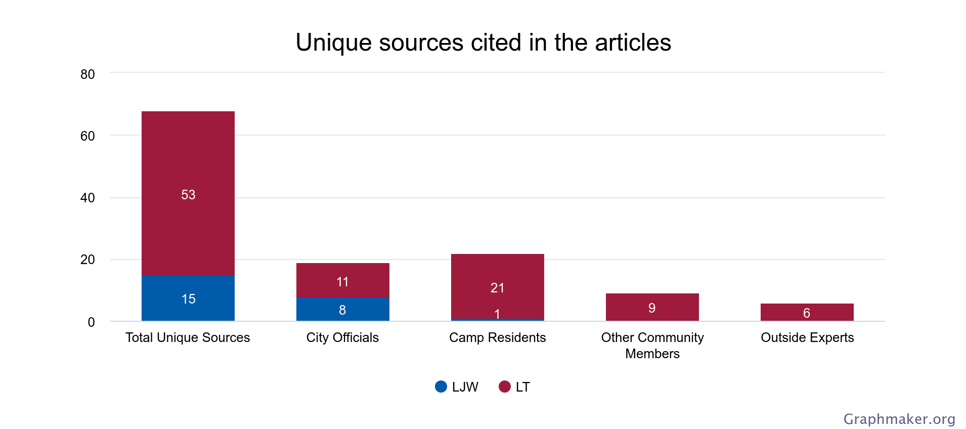 Of those sources, the Journal-World cited eight city officials and one camp resident while the Times cited eleven city officials and 21 camp residents.