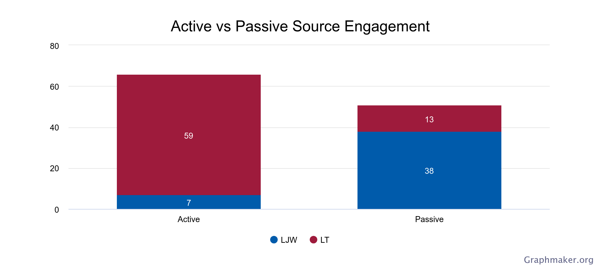 Despite having a smaller news team and presumably smaller budget than the Journal-World, The Lawrence Times actively engaged with 59 sources while the Journal-World only actively interacted with seven sources.