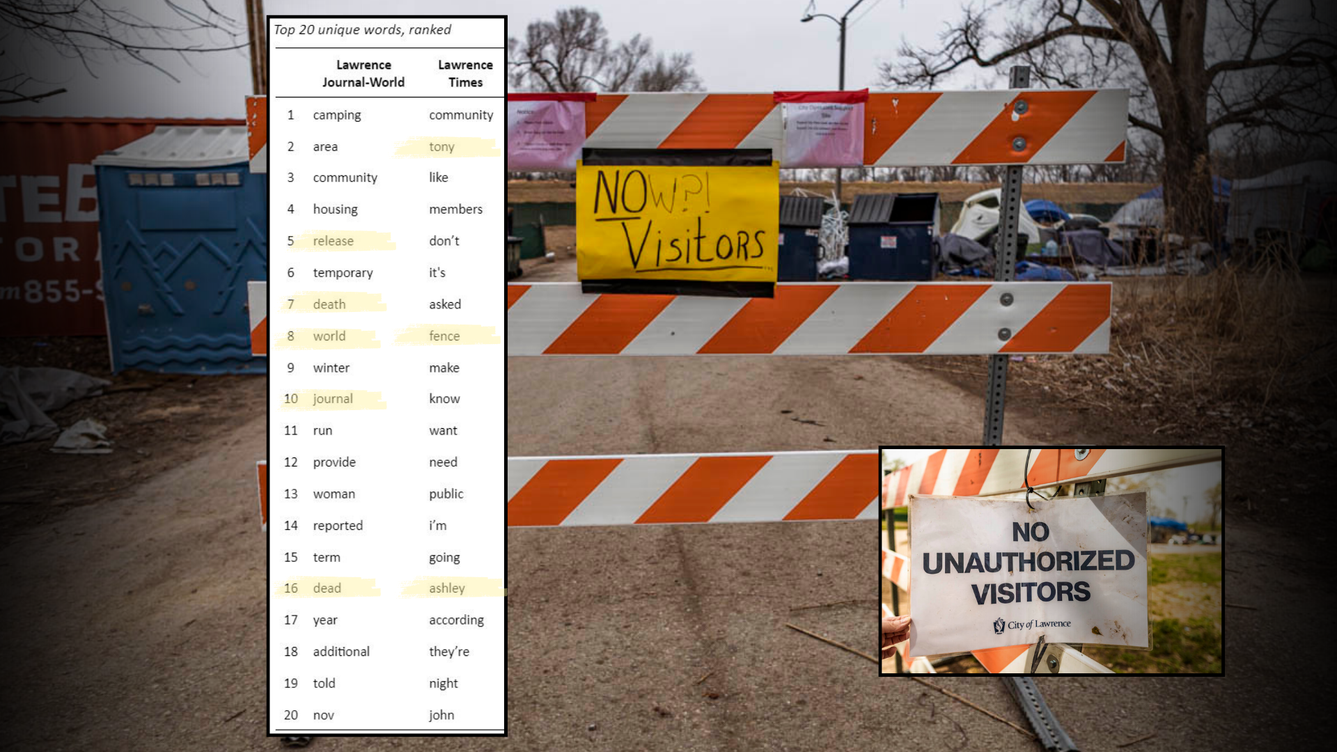 For this analysis, I paired 36 articles on stories that each publication covered regarding the city-run North Lawrence campsite for people experiencing homelessness between November 2022 and April 2023. The articles included stories on the deaths of three camp residents, relevant city commission meetings, and general campsite news. Each story I included has a corresponding article at both publications, so it was a 1:1 analysis.